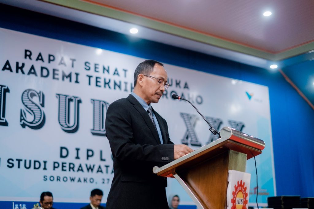 Bapak Harjuma juga memberikan sambutan pertama dengan memaparkan laporan kinerja ATS dalam bidang penelitian, pengabdian masyarakat, dan pendidikan. Beliau juga memaparkna bahwa tahun ini 29 mahasiswa memiliki masa tunggu kerja nol bulan karena telah diterima bekerja di industri. Selain itu dipaparkan juga keberhasilan ATS yang telah menambah 1 prodi S-1 Terapan yaitu Progragram Studi Teknologi Pengelasan dan Fabrikasi.