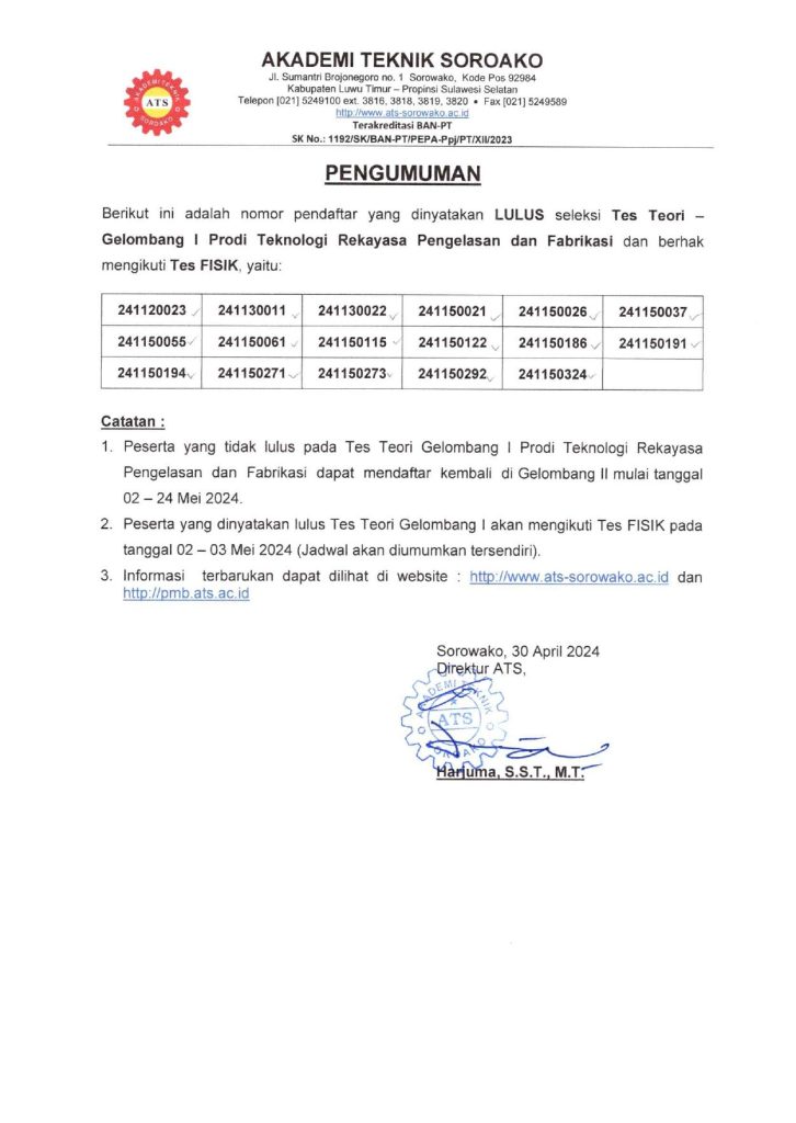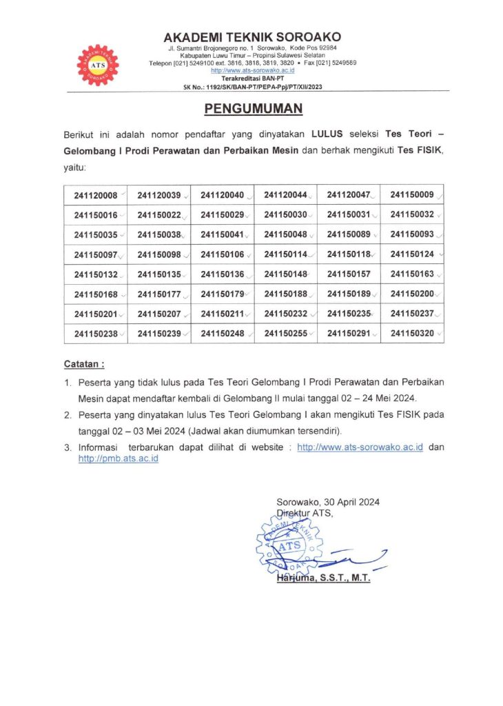 Pengumuman Kelulusan Tes Teori PMB ATS Gelombang-1 Tahun 2024